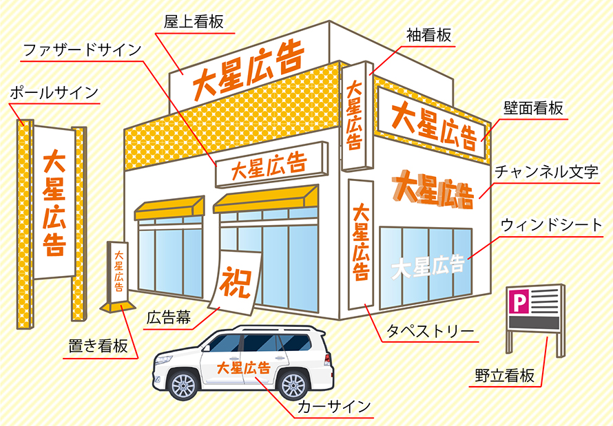 看板も大型になるので、店名やロゴマークなどのシンプルな内容を掲出し、遠くからの目印になる看板です。